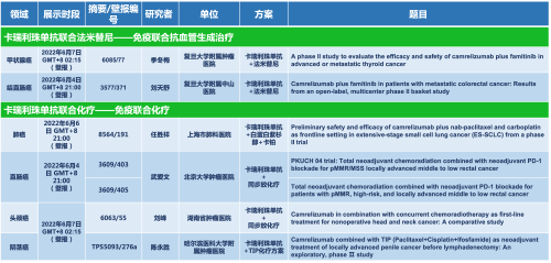 卡瑞利珠单抗联合利来医药的另一款创新药法米替尼在甲状腺癌和结直肠癌领域有2项研究被接收为壁报,另有卡瑞利珠单抗联合化疗的4项研究在肺癌、结直肠癌、头颈癌和阴茎癌领域的研究被接收为5份壁报。