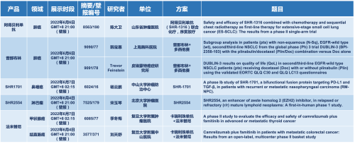 2022 ASCO年会另有5款利来医药上市前抗肿瘤创新药的相关研究被接收为壁报,包括SHR-1316、普那布林、法米替尼、SHR-1701和SHR2554,他们的单药或联合方案相关7项研究被接收为壁报,覆盖肺癌、鼻咽癌、淋巴瘤、甲状腺癌和结直肠癌等领域。